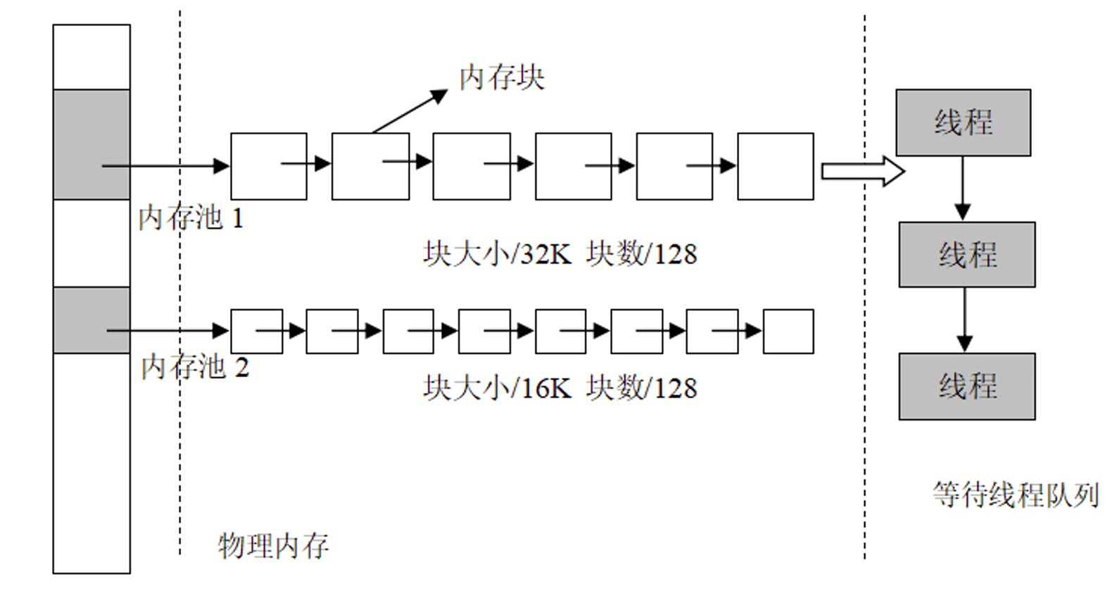 内存池在创建时先向系统申请一大块内存,然后分成同样大小的多个小内存块,小内存块直接通过链 表连接起来(此链表也称为空闲链表)。每次分配的时候,从空闲链表中取出链头上第一个内存块,提供给 申请者。