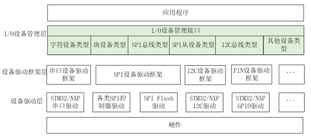RT-Thread 提供了一套简单的I/O设备模型框架,如下图所示,它位于硬件和应用程序之间,共分成 三层,从上到下分别是I/O设备管理层、设备驱动框架层、设备驱动层。