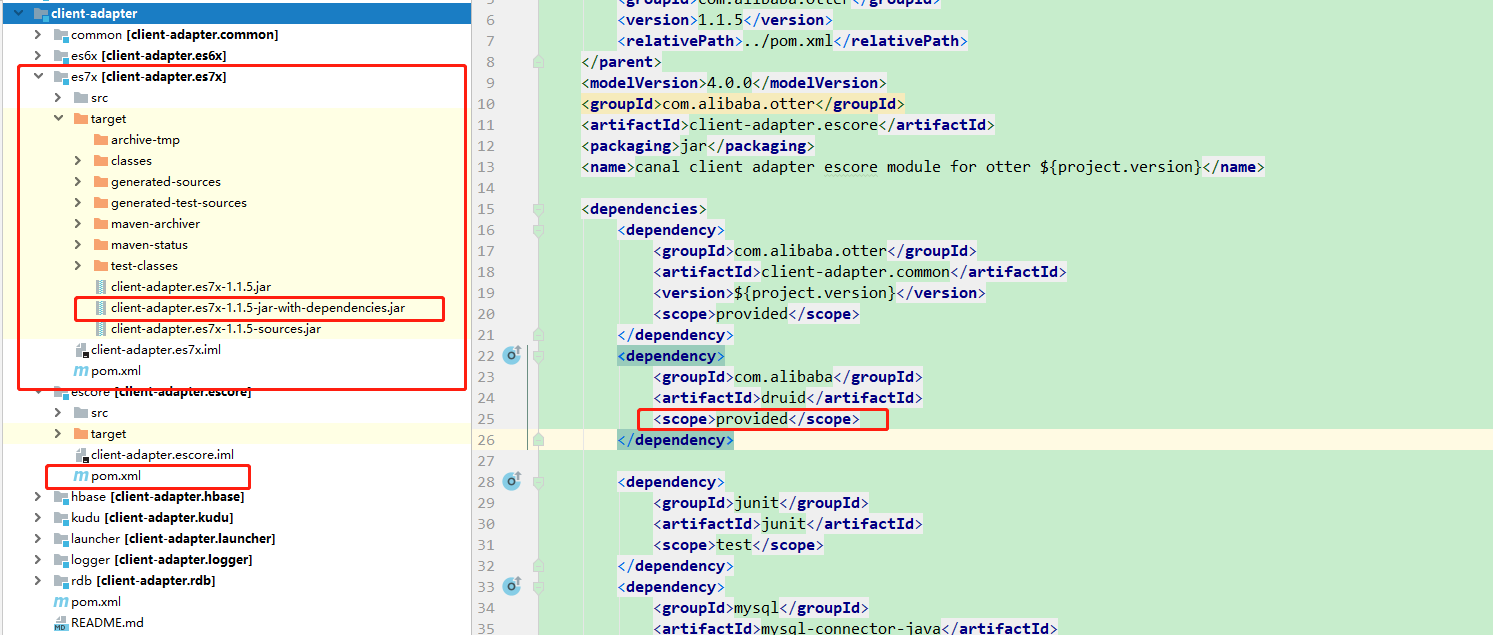 4.启动可能会出现数据源类转换异常,需要下载源代码然后解决冲突,找到escore项目修改数据源依赖范围,重新打包找到 client-adapter.es7x-1.1.5-jar-with-dependencies.jar 上传到plugin文件夹