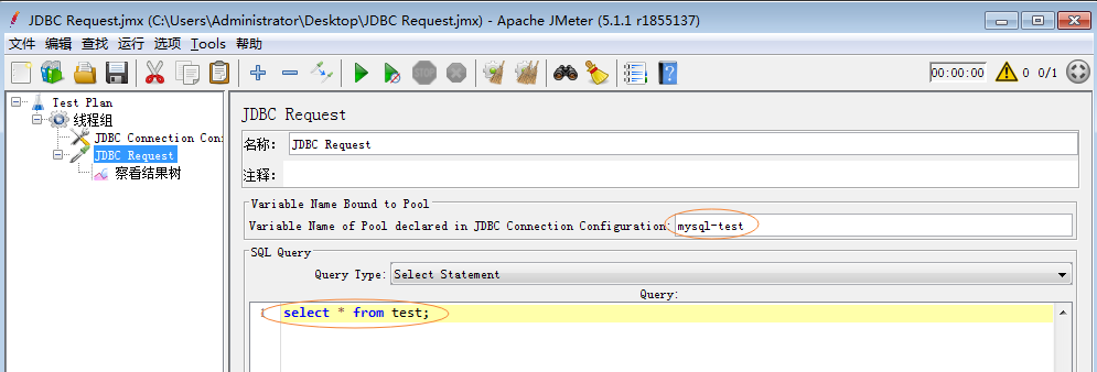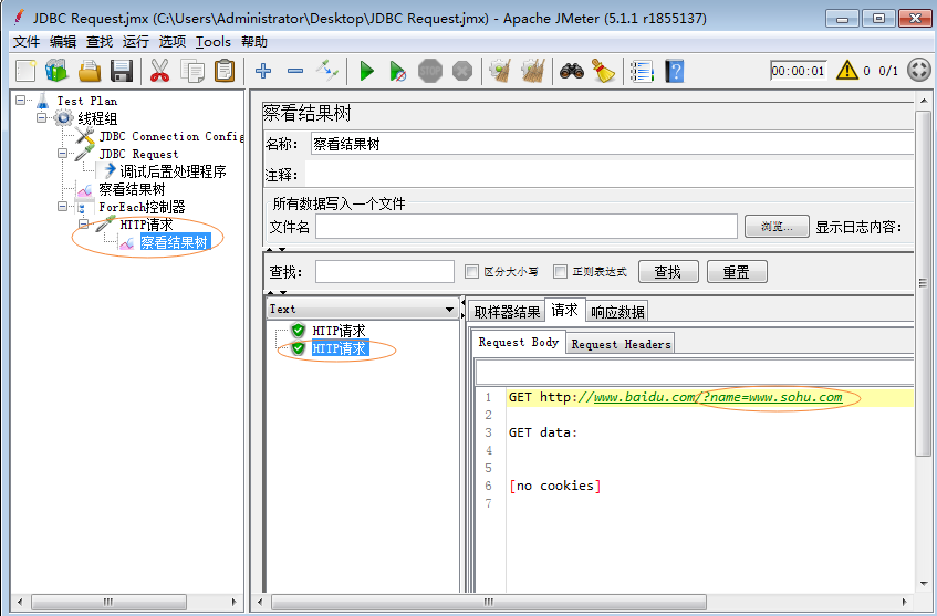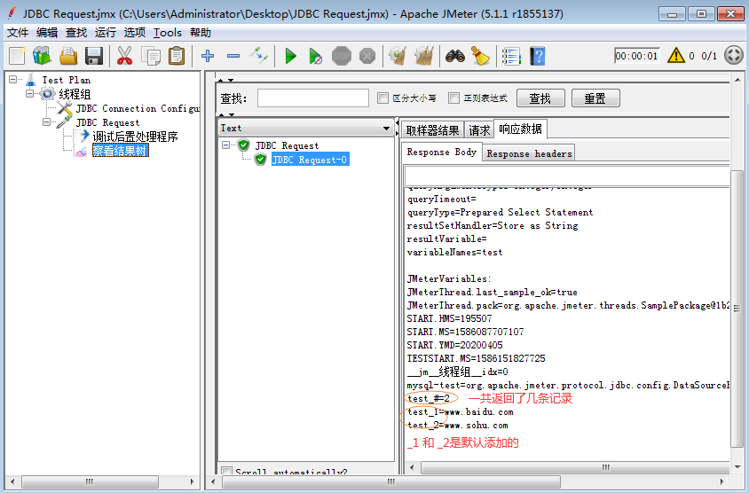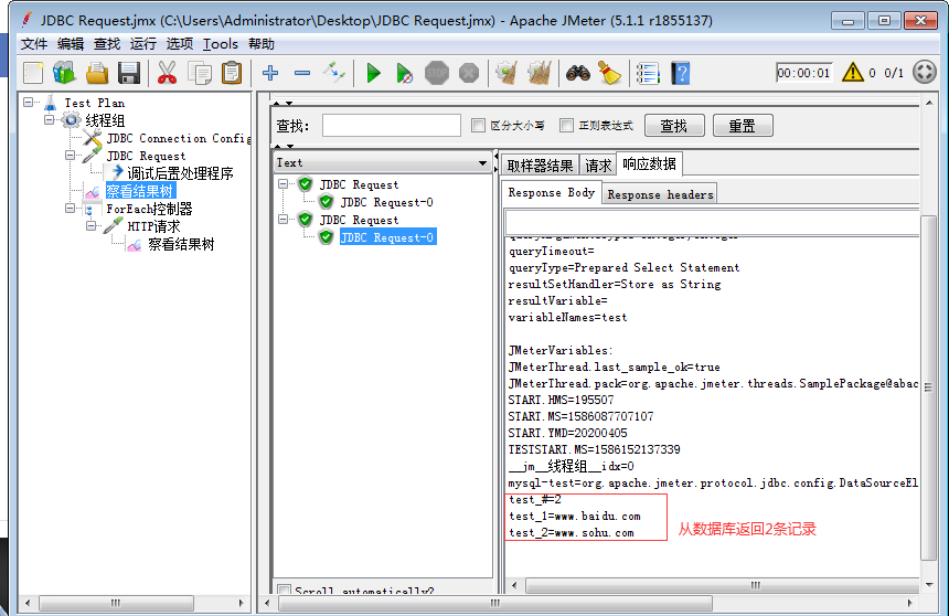 如果后面的请求要用到数据库返回的值,就可以通过传递jdbc请求中的变量来处理