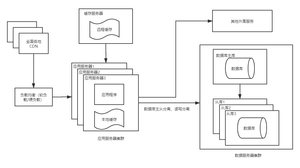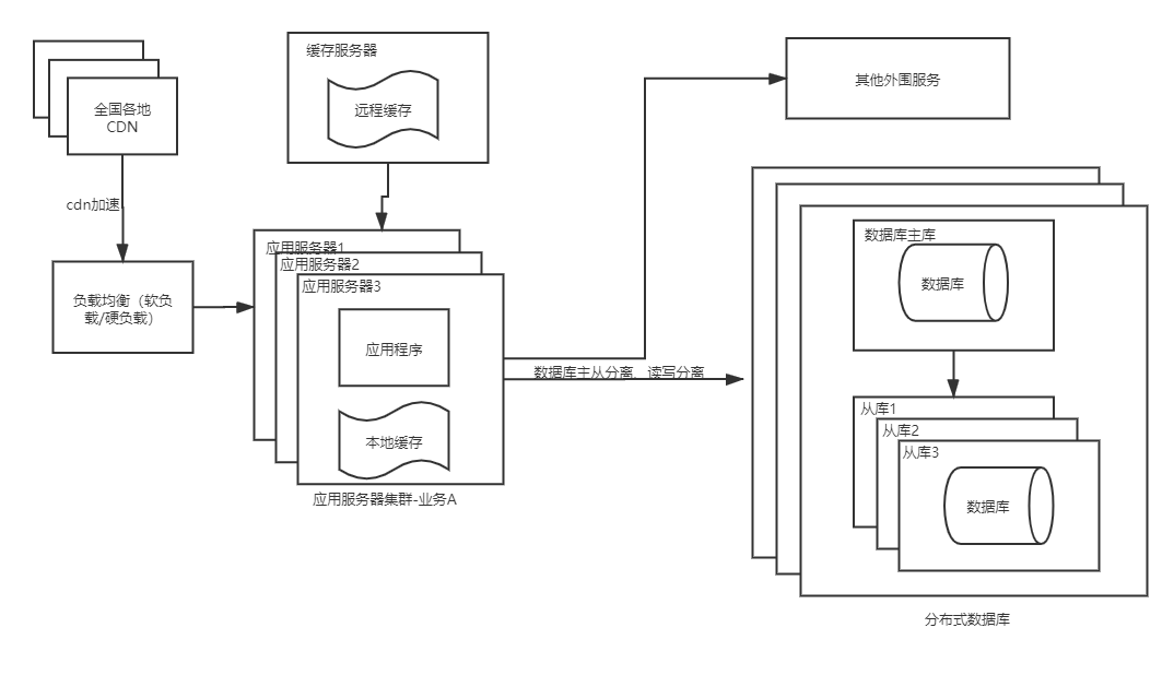 5、这个阶段,数据继续增加,请求数量继续加大,单个数据库已然不能满足要求,这个时候需要部署多个数据库,实现读写分离,同时CDN加速,从最近的服务器上获取资源,提高访问速度
