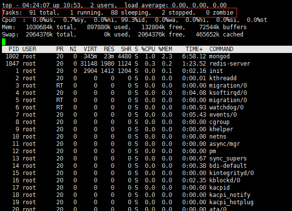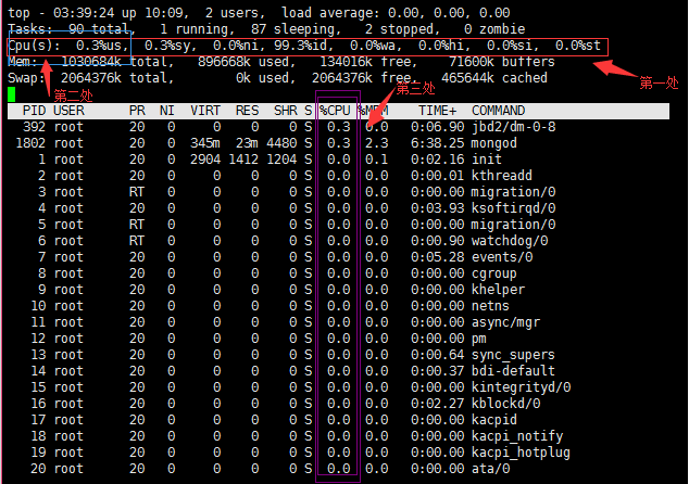 cpu利用率总和=红框内所有项相加,主要看us 和sy;(看第一处)