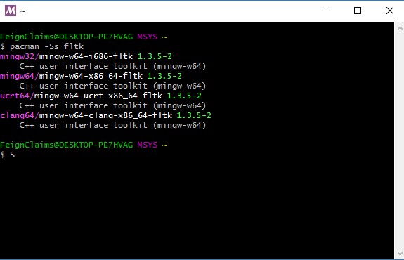 比如《C++程序设计:原理与实践》一书中提到 FLTK 库。输入「pacman -Ss fltk」进行搜索,会查找到众多包名。由于使用的是clang64,所以需要安装以clang64/开头的「mingw-w64-clang-x86_64-fltk」。可以通过右键进行复制,接着输入「pacman -S mingw-w64-clang-x86_64-fltk」即可安装。