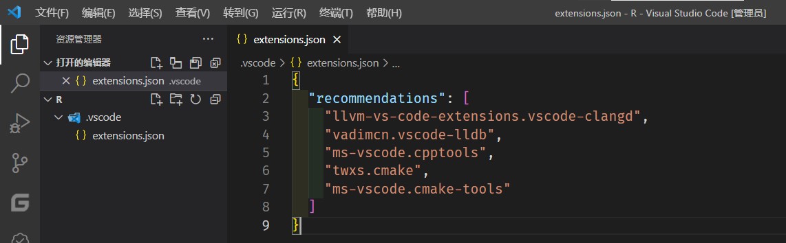 用「VSCode」打开一个文件夹,在该文件夹中新建名为「.vscode」的文件夹,在其中新建全名为「extensions.json」的文件,并在其中加入如下代码。