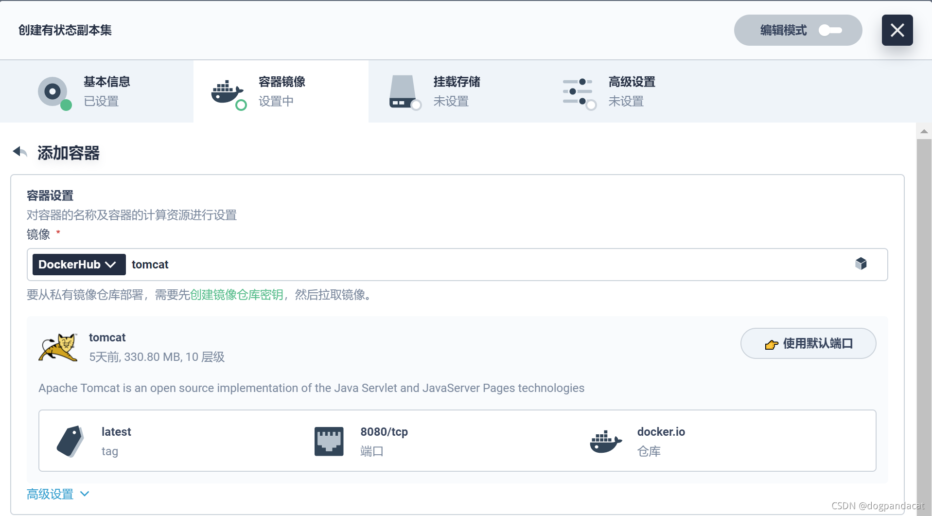因为前面选择的是tomcat镜像,这个镜像有300多MB,所以创建需要一些时间,正在从dockerhub拉取。
