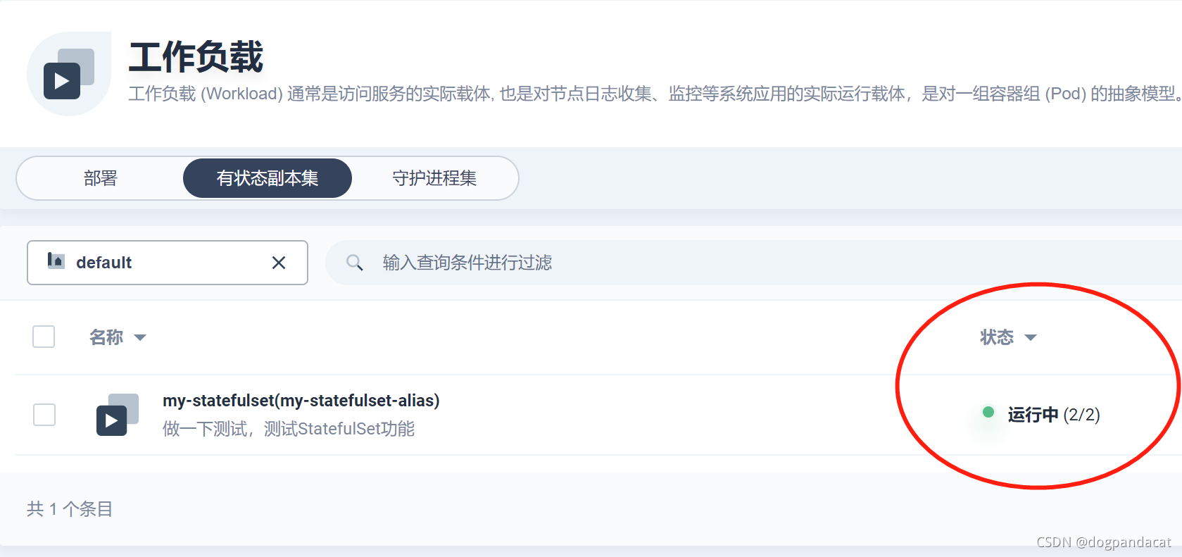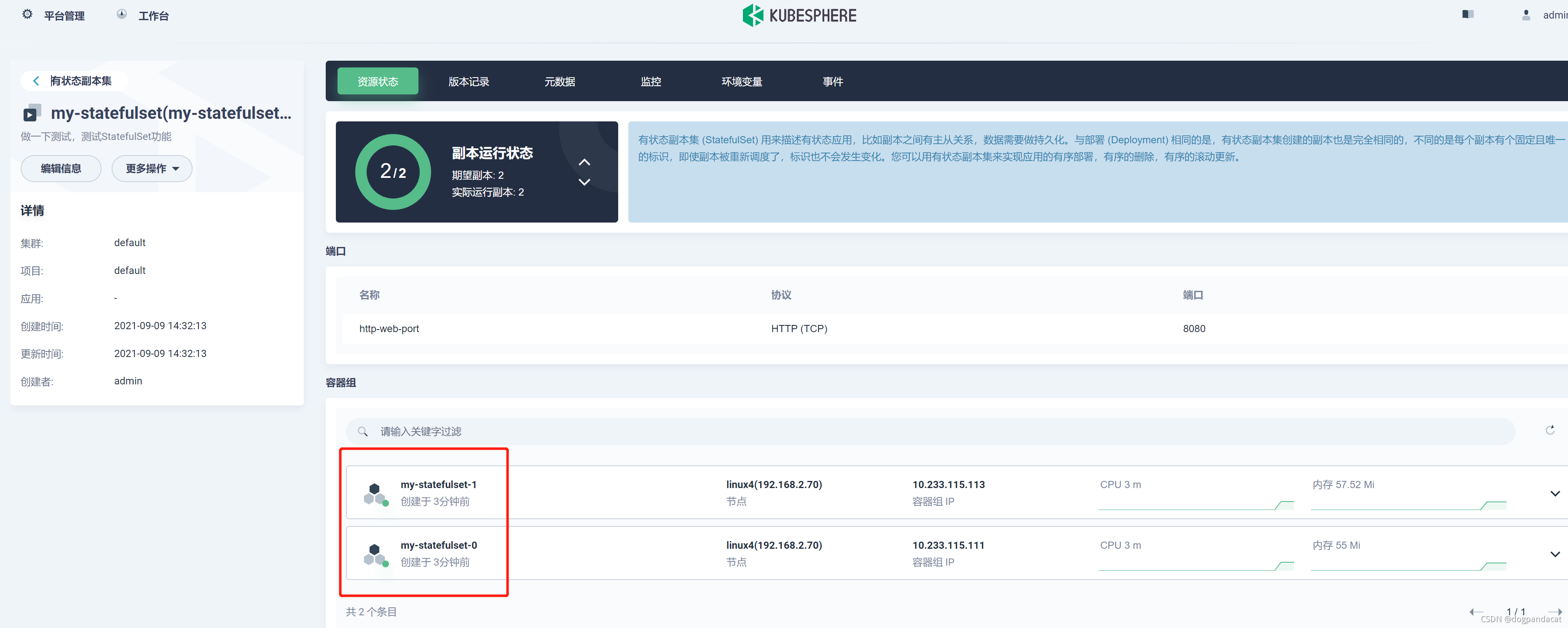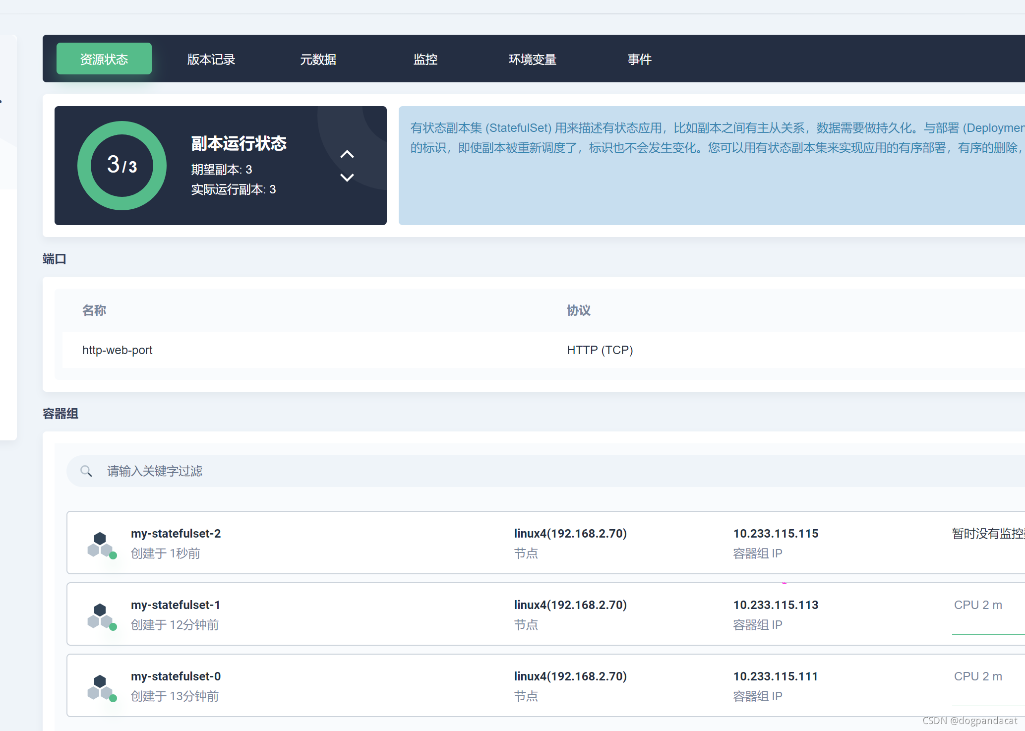 看这个StatefulSet的详情,因为之前创建的时候指定replicas: 2,所以这里有2个POD,注意这个POD里面只有一个容器,同时,POD的IP地址也可以看得到。