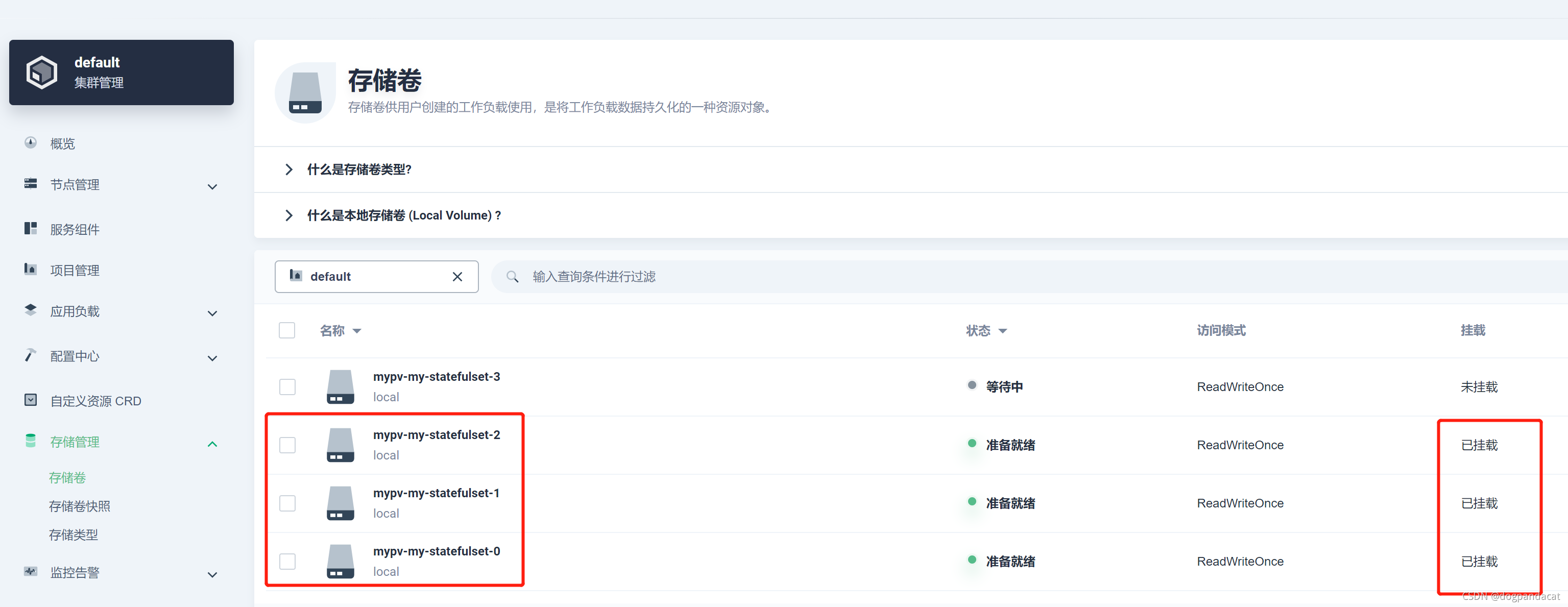 这里要注意:这个statefulSet中一个部署了3个POD,注意看,每个都关联了一个存储卷,如果对POD进行扩缩,这些存储卷不会消失,而且还会和POD一一对应。