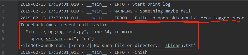 Python中的traceback模块被用于跟踪异常返回信息,可以在logging中记录下traceback,代码: