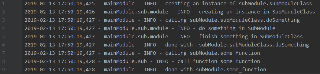 首先在主模块定义了logger'mainModule',并对它进行了配置,就可以在解释器进程里面的其他地方通过getLogger('mainModule')得到的对象都是一样的,不需要重新配置,可以直接使用。定义的该logger的子logger,都可以共享父logger的定义和配置,所谓的父子logger是通过命名来识别,任意以'mainModule'开头的logger都是它的子logger,例如'mainModule.sub'。