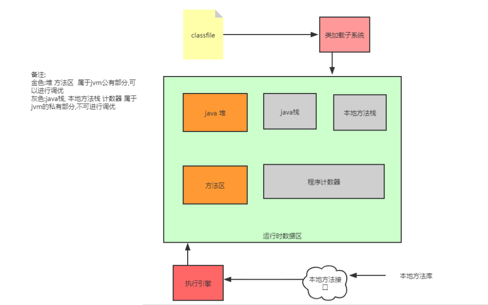 - 类加载系统:JVM会使用双亲委派的方式,进行加载字节码文件到内存中;首先BootStrap ClassLoader(根类加载器)尝试加载,Ext ClassLoader(拓展类加载器),Application ClassLoader(应用类加载器),最后自定义ClassLoader,如果都没有加载成功会抛出ClassNotFound异常;一般用户写的代码都是由应用类加载加载的。【双亲委派:再类加载的过程中,会优先委派父加载器加载,如果加载失败,再交由子加载器加载;】