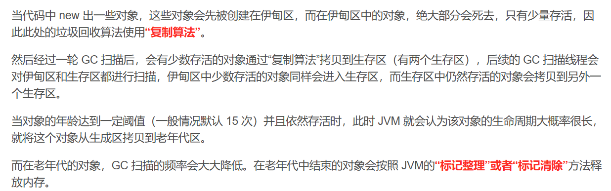 - 复制算法(新生代):其实也就是重新开辟一个与当前内存区域一样的内存区域,将旧区域的对象复制到新区域中,最后统一释放旧区域;这个可以解决内存碎片问题,不过会占用大量内存;