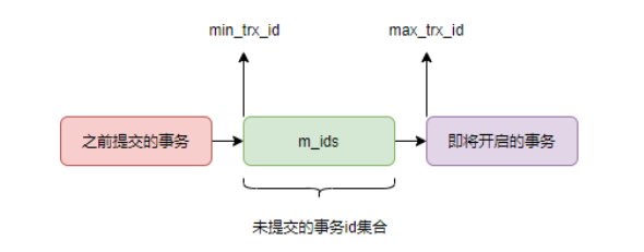 - ReadView里的几个字段:m_trx_id(未提交活跃事务id),min_trx_id(未提交活跃事务id集),max_trx_id(将要执行的事务id);