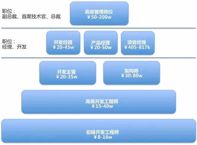 我们来看看从一个初级的程序员到技术岗位顶端CTO有哪些岗位可以选择,目前的收入区间是怎么样的,以及对这些岗位应该有什么样的预期。