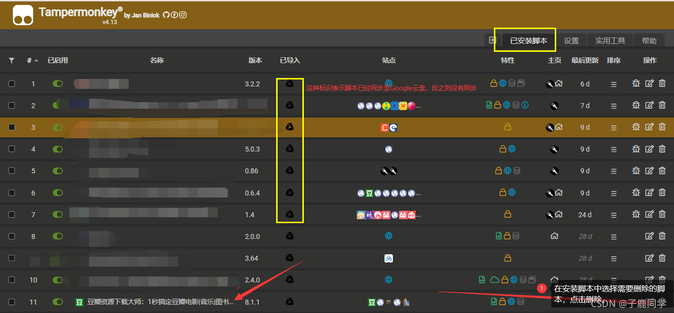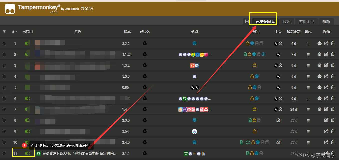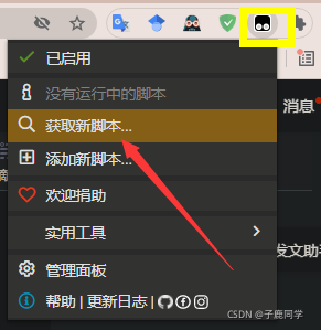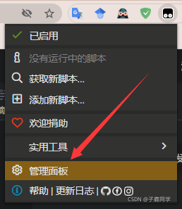 - 安装好脚本后,脚本会可以点击Tampermonkey的头像进入“管理面板”进行开启脚本运行。