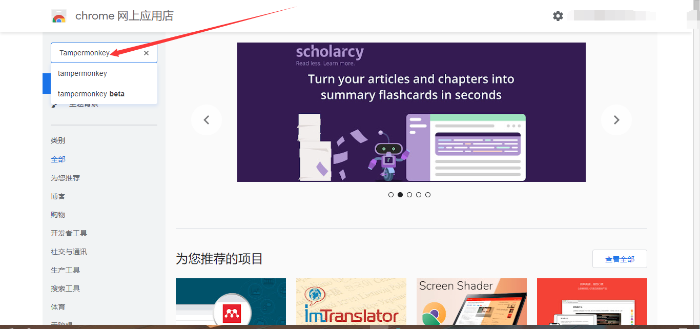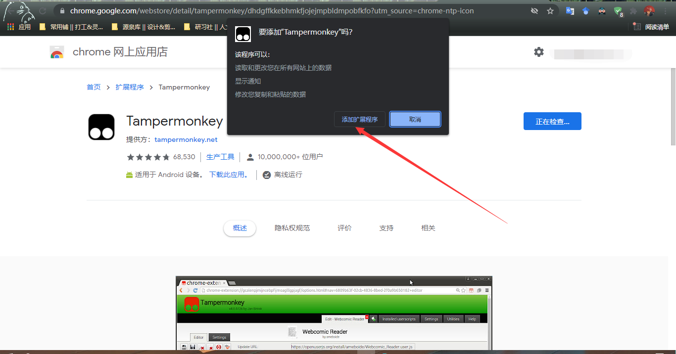,然后它就会出现在你的浏览器界面,方便以后查找。(安装后程序后自动跳转,但是不用管,为了演示,我换了个主题色,方便看) - 点击界面上的“Tampermonkey”头像