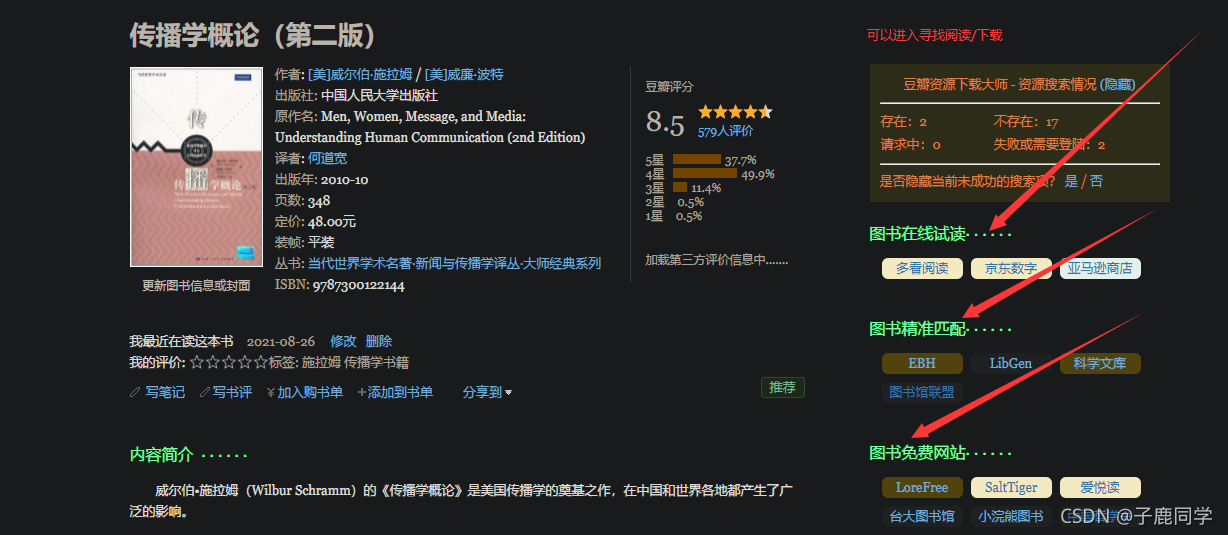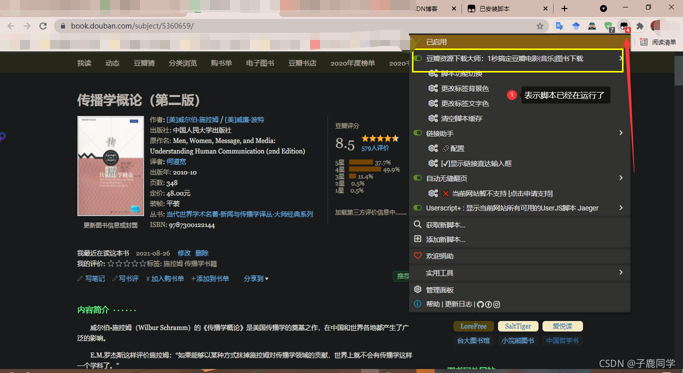 - 在插件中打开对应的脚本,使脚本开始运行后(例如刚刚下载好的“豆瓣大师”为例),进入豆瓣的网址,选择任意一本书/影视/音乐等等,点击进入(首次运行脚本会弹出一个窗口,选择“总是允许全部域名”就好,我这儿因为不是首次运行,所以没有弹出窗口)
