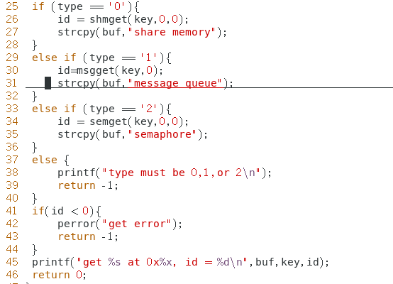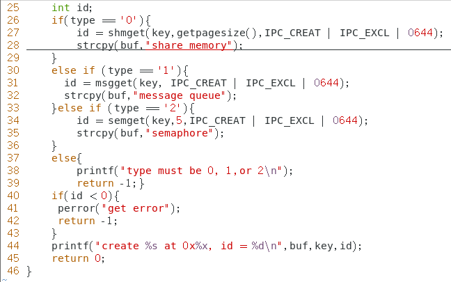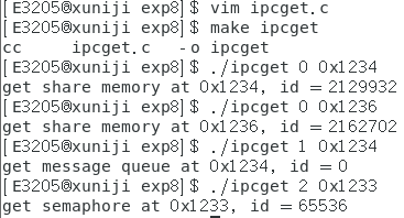 程序 ipcget 用于在指定的键值上获取 ipc 内核对象的 id 号。使用格式为 ./ipcget ,比如 ./ipcget 0 0x8888 表示获取键值 0x8888 上的共享内存 id 号。