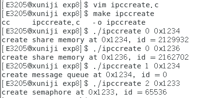 例:程序 ipccreate 用于在指定的键值上创建 ipc 内核对象。使用格式为 ./ipccreate ,比如 ./ipccreate 0 0x8888 表示在键值 0x8888 上创建共享内存。