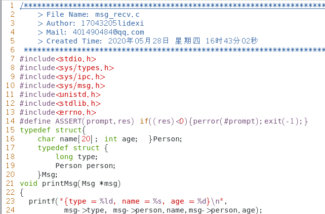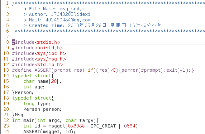 6. 编写两程序分别用于向消息队列发送数据和接收数据。 msg_send 程序定义了一个结构体 Msg , 消息正文部分是结构体 Person 。该程序向消息队列发送了 10 条消息。