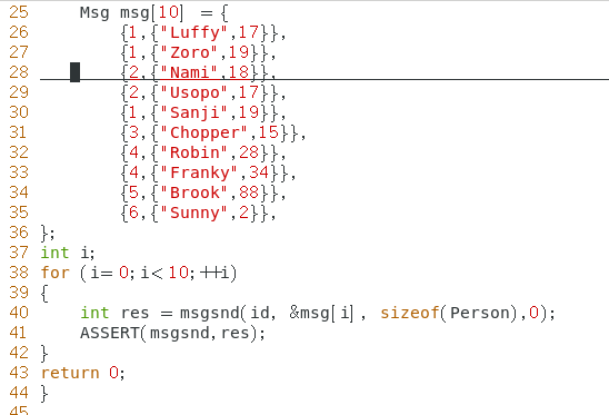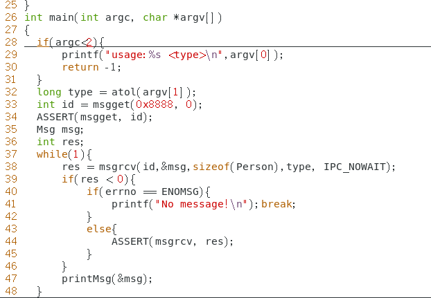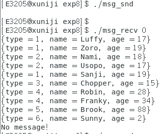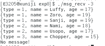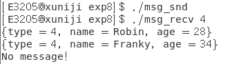 msg_recv 程序接收一个参数,表示接收哪种类型的消息。比如 ./msg_recv 4 表示接收类型为 4 的消 息,并打印在屏幕