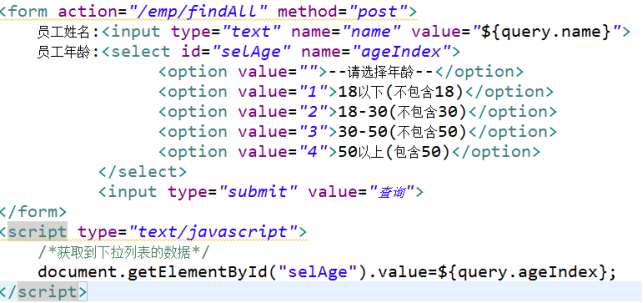 <table border="1" align="center" cellspacing="0" width="400px"> <form action="跳转后台controller地址" method="post"> 员工姓名:<input type="text" name="name"> 员工年龄:<select name="ageIndex"> <option value="1">18以下(不包含18)</option> <option value="2">18-30(不包含30)</option> <option value="3">30-50(不包含50)</option> <option value="4">50以上(包含50)</option> </select> <input type="submit" value="查询"> </form> </table> |
