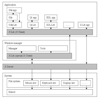 应用程序如果想显示数据,需要利用X Lib库建立X窗口(X Client),它通过X协议与X Server通讯,让X Server完成显示;X Server会把接到键盘鼠标事件,传给焦点所在的X Client处理