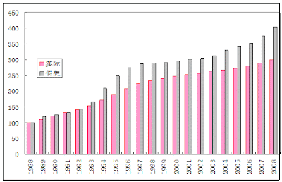 说真实回报率,可能让很多人觉得不直观,所以我就做了下面这一副图。粉红色的柱子是如果你在1988年底存进银行100块,然后把每年的利息也存进去之后,每年你在银行的余额。1988年的100块,最后到了2008年会变成300块(请注意,2008年的300块,因为通胀的原因,并没有1988年的100块更值钱,前面已经说了,折合成1988年的人民币,2008年的300块只等于97块)。灰色的柱子是一个假想的情形,就是如果银行的利率始终比通胀率高1.6,也就是保证存款的真实回报率能达到1.6。这样1988年的100块,到了2008年就应该是404块。404块要比300块多出34.6%,这就是正的1.6的真实回报率和中国的实际回报率,在20年里拉出的差距。