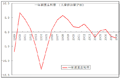 但是存款利率和通货膨胀率是比较容易得到的,因此真实回报率也比较容易计算。所以,我就找来了数据,算了一下,做了两幅图。第一副图是1989年以来中国的一年期的真实存款利率(当年的平均一年期名义利率-当年的平均通货膨胀率)。从1989年开始,是因为那是我手头可以找到的最早的数据。从这副图可以很明显的看出,首先中国的真实存款利率在很多年都是负的,换句话说,存款的利息不足以补偿通货膨胀。然后,即使在正的年份,也没有特别正,但是在负的年份可以非常负。第三,2009年的回报率可能会是正的,但是,2007和2008连续两年都是负回报,2009年的通缩是在2007和2008年通胀的基础上才出现的。