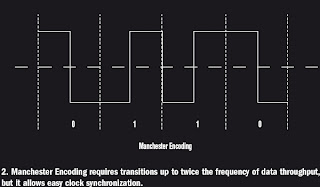 答:曼彻斯特编码又称曼彻斯特相位编码,它通过相位变化来实现每个位(图2)。通常,用一个时钟周期中部的上升沿表示"1",下降沿表示"0"。周期末端的相位变化可忽略不计,但有时又可能需要将这种相位变化计算在内,这取决于前一位的值。