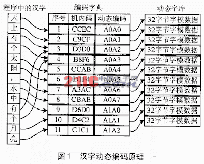 实现汉字动态编码的关键是建立编码字典和改写机内码。下面以是显示1行汉字"天上有个太阳,水中有个月亮"为例,说明动态编码的实现过程。