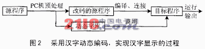 实现汉字动态编码的过程就是先进行汉字识别,然后建立编码字典、提取字模、建立动态字库、改写机内码。首先扫描一遍程序文件,识别其中的汉字,将它们按出现先后顺序或机内码的大小排序,重复出现的剔除,建立了一个编码字典;根据汉字在编码字典的位置(序号),可以对汉字按区码、位码进行编码,也可以采用其它的方法编码,总之序号与它的动态编码存在一一对应关系;根据字典中每个汉字的机内码依次从PC机的汉字点阵字库中提取字模,顺序存储,建立一个小规模的动态字库,这样每个汉字的字模在字库中的位置就与其在编码字典中的序号、动态编码一一对应了。最后,再扫描一遍程序文件,按照编码字典将每个汉字的机内码改写为对应的动态编码。因为程序文件中的汉字随时会增减,编码随之而变,字库的大小也随时在变。所以称之为动态编码和动态字库。