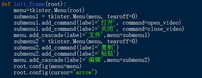 主要功能是定义文件菜单下的打开和关闭子菜单,然后分别对子菜单关联控制事件:打开播放视频事件和关闭播放视频事件。
