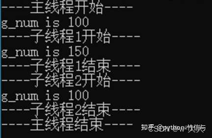 print("----主线程结束----")上述代码中,定义一个全局变量g_num,赋值为100,然后创建2个线程。一个线程g_num增加50,一个线程将g_num减少50。如果g_num的最终结果为100,则说明线程之间可以共享数据。