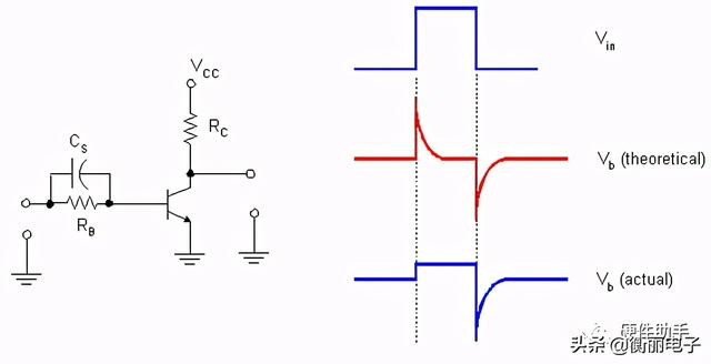 在要求快速切换动作的应用中(中高频开关),必须加快三极管开关的切换速度。可以在基极串联电阻上并联一只加速电容器,当Vin由零电压往上升并开始送电流至基极时,电容器由于无法瞬间充电,故形同短路,输入瞬间的变化量直接引入到三极管基极,用过冲加快三极管的状态变化(电容的作用类似RC上电复位!),因此也就加快了开关导通的速度(三极管迅速从截止状态进入饱和导通状态)。等到电容充电完毕后,电容就形同开路,而不影响三极管的正常工作;当Vin从高变低时,电容也瞬间导通,为泄放基极电荷提供一条低阻通道,这样就加速了晶体管的关断。电容通常取值几十到几百皮法。