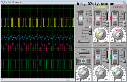 示波器图(黄色:555的3脚输出固定频率脉宽的方波,蓝色:555的6脚输出的三角波,红色:Q1基极输入的可调脉宽方波,绿色Q1集电极输出的可调脉宽方波)