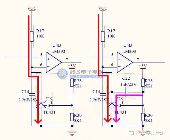 先看左边的电路,假如5V输出突然升高,KA内阻减小,回路上的电流增大,那么增大的这部分电流叫做增量电流。那么,再来看右边这个电路,假如5V输出突然升高,C22这个电容上也有了一个电流,再经过KA流到地,比左边的电路多了一条回路。然而,5V输出的变化,引起KA内阻上流过的电流变化,由于微分D的参与,分担了一部分电流,那么对于增量电流,就相对减小了,一般地,微分电容一般都是nF级别的。这与刚刚讲的公式也能对应起来的。