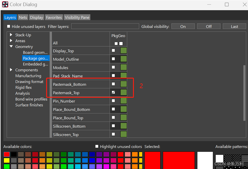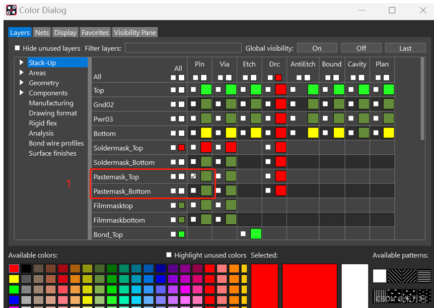 在颜色管理器中打开钢网,stack-up中pin有钢网,package geometry中有钢网,其他没有了。