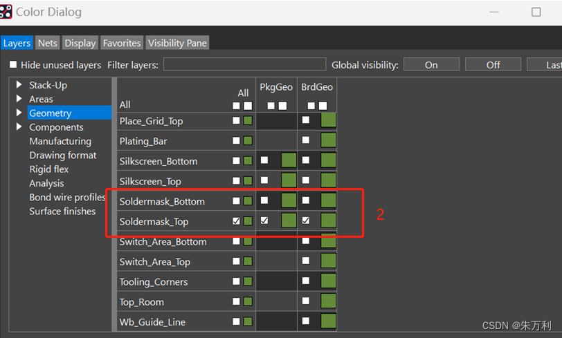 包括stack-up中的pin、via的阻焊、package geometry和board geometry里的阻焊,同时visibility里什么都不要勾选: