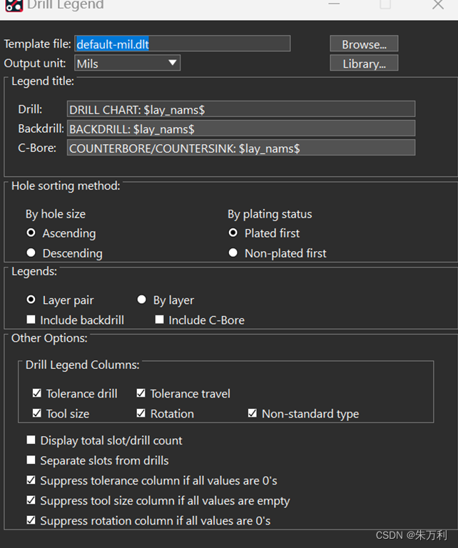Manufacture-NC-drill legend,可以使用默认设置直接点击OK,也可以勾选显示总过孔数量和区分槽孔和过孔。