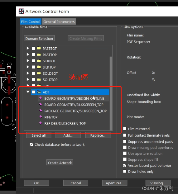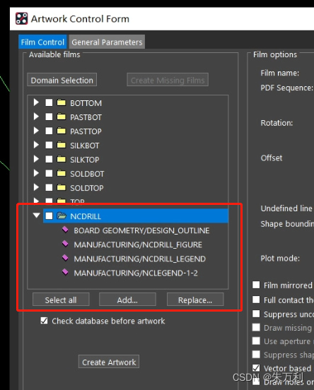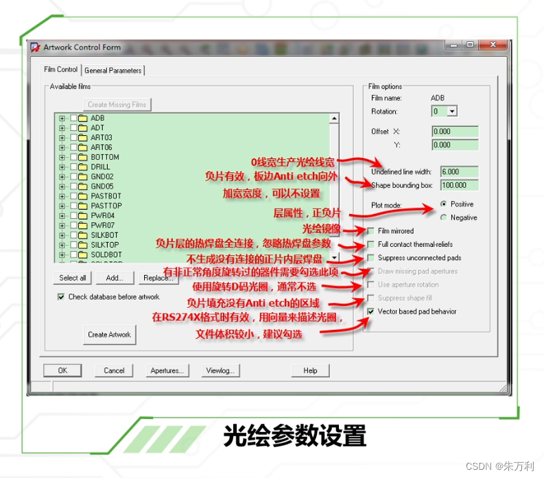 Manufacture-artwork,设置导出光绘的参数:没有定义的线宽设置为6、负片层anti-etch外扩的大小设置为100、走线层选正片、平面层选负片、再勾选倒数第二个框,所有层都按此设置一遍。