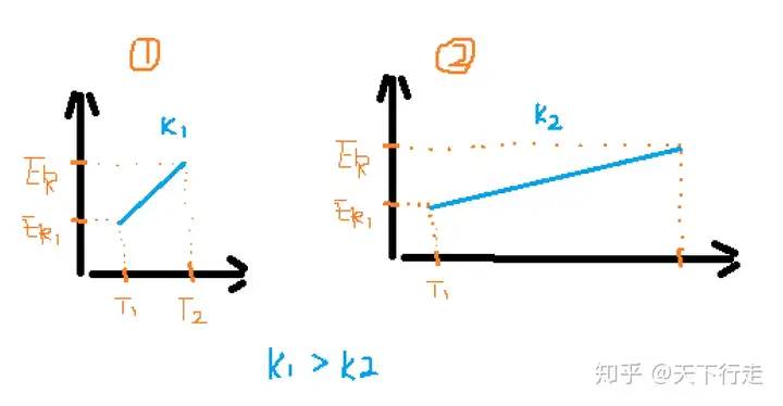 此时可以试想一下,上次偏差小,本次偏差大,若此时建立时间t为x轴、偏差E为y轴的坐标系,便能发现两次偏差的斜率为正(“\”左低右高)。且Dk越大越陡。