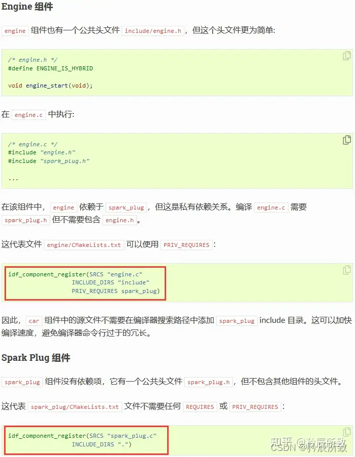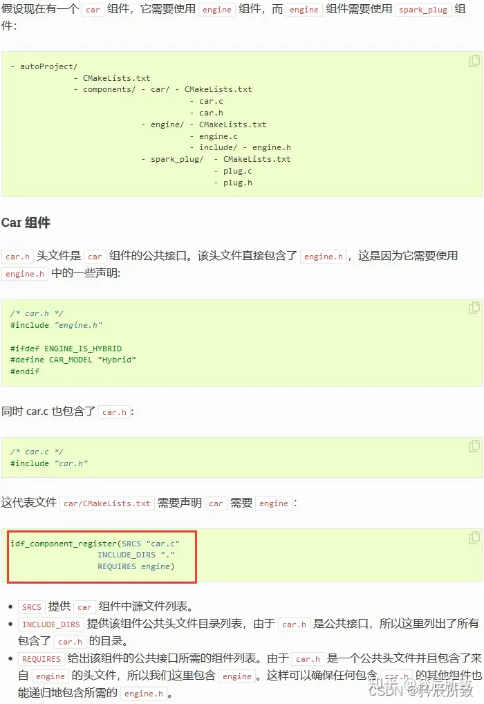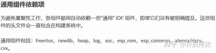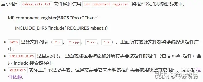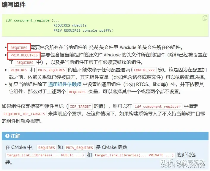 组件中的 CMakeLists.txt 的核心,我们必须要学会如何修改,才能完善自己的工程,所以对于组件依赖我们需要但是介绍,这里官方的讲解比较详细,借用官网介绍截图说明: