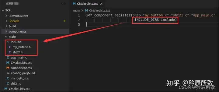 这个文件我们需要修改,工程中在 main 文件夹下面,我多放了几个.c文件,就需要都添加进去。如果我们把头文件放在同一个文件夹里,也需要修改,比如: