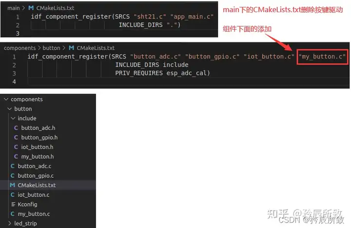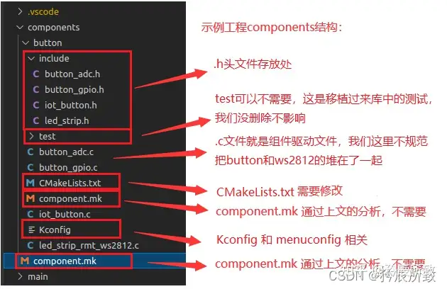 再看看 components 文件夹下面的整体框架,在示例项目中,只有一个 button 子文件夹(就连led_strip的驱动文件我都直接放置button文件夹下面,因为当时放在另外一个文件夹编译出错= =!):