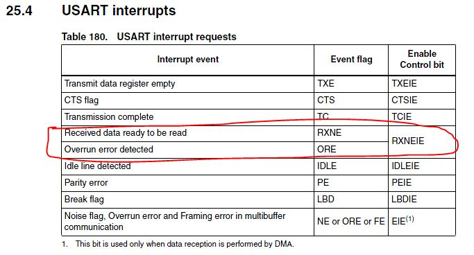 也就是说只要接收中断打开,即RXNEIE设置为1,那么ORE中断也自动打开了。