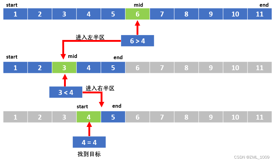 再取一半为3, 3 小于 4。则说明要找的数在后一半,此时start需要挪到mid+1处