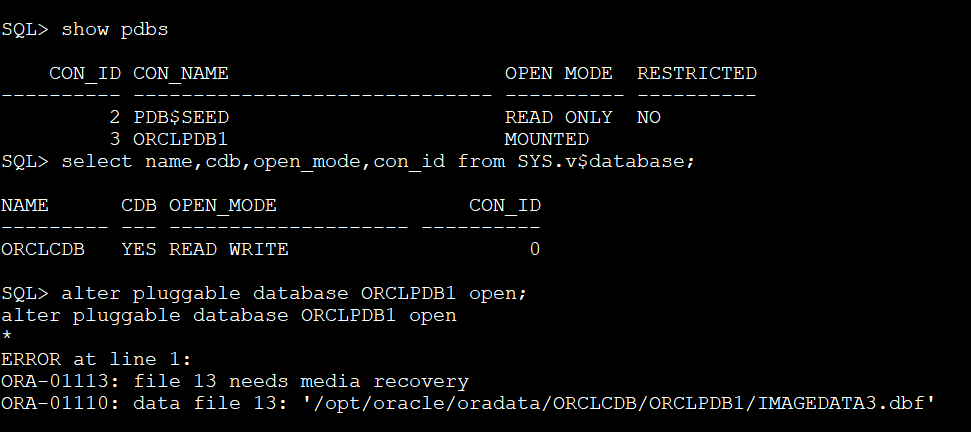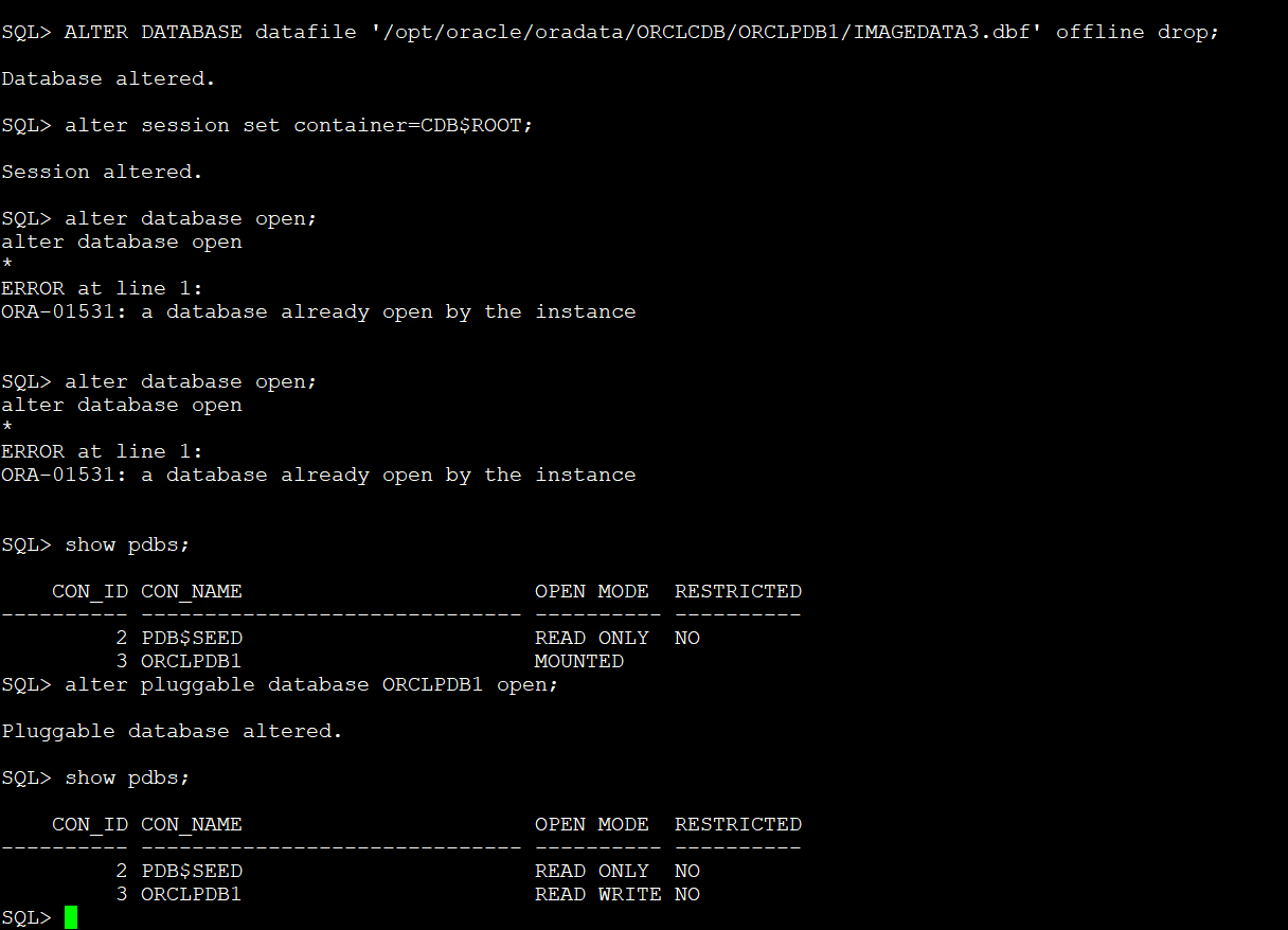 #我删除的是容器数据库里的表空间 alter session set container=ORCLPDB1; ALTER DATABASE datafile '/opt/oracle/oradata/ORCLCDB/ORCLPDB1/IMAGEDATA3.dbf' offline drop;