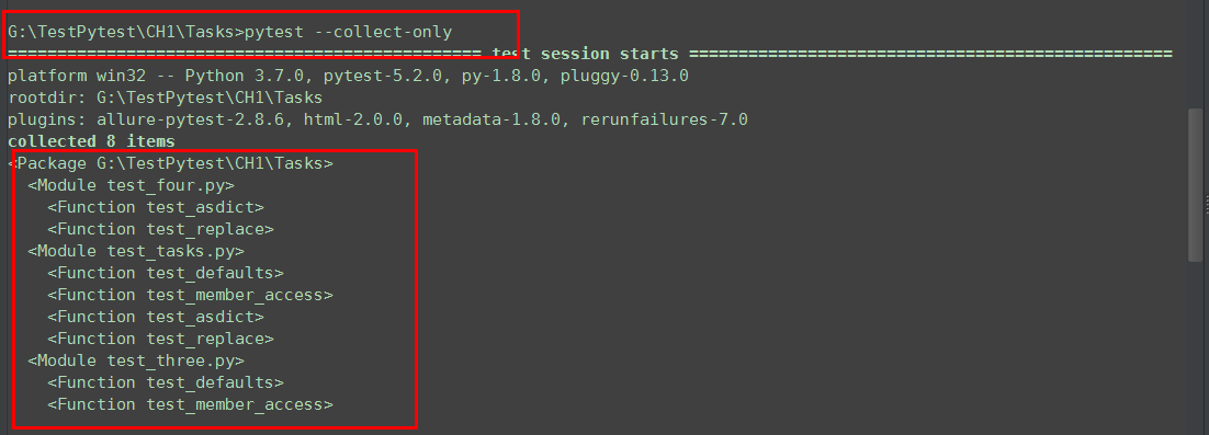 1、--collect-only选项,该选项的输出内容可以作为一种参照,展示当前目录下的全部测试用例
