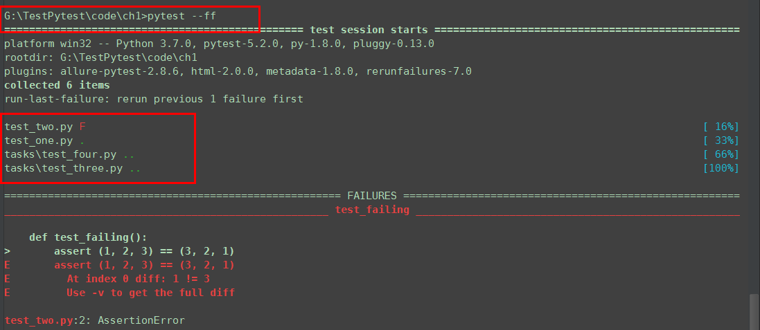 8、--ff (--failed-first)选项与--last-failed选项的作用基本相同,不同之处在于--ff会运行完剩余的测试用例