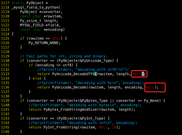 当前使用的mysqlclient-1.4.6版本,查看mysqlclient-1.4.6/MySQLdb/_mysql.c中代码后发现是转码时指定的参数有问题: